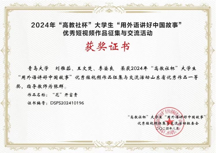 英语系张群老师指导、刘雅茹、王文楚、李姿良同学的团队作品《“花”开富贵》脱颖而出,荣获山东省一等奖。
