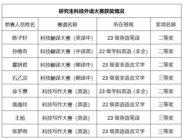 学生在大赛中努力拼搏,斩获多个奖项,共获得二等奖6项,三等奖10项。其中,本科生获奖8项,李怡琳、刘诗雨在科技写作大赛(英语)获二等奖,陈晓杨、崔雪芸、林连祺、于佳汐、朱欣雨获三等奖;邢柄柔在科技演讲大赛(日语)中获得三等奖。研究生获奖8项,其中陈子轩获科技翻译大赛(英译中)二等奖,孙维奇获科技翻译大赛(中译英)二等奖,霍研君获科技翻译大赛(朝译中)二等奖,石乙淙获科技翻译大赛(朝译中)三等奖,徐千惠获科技写作大赛(英语)二等奖,高逸玲、王旭、张梦雨获三等奖。