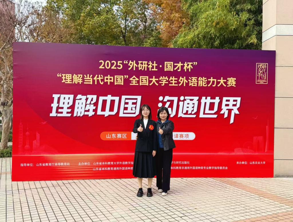 2025年11月1-2日,2025“外研社·国才杯”“理解当代中国”全国大学生外语能力大赛口译赛项和演讲赛项(山东省省赛)在山东农业大学顺利举行。在口译赛项中,2025级英语笔译专业胡婧雅同学(指导教师卞建华)和2025级英语口译专业刘世莹同学(指导教师吕云)荣获金奖。在演讲赛项中,2023级英语系赵嘉琪同学荣获金奖(指导老师李俊蕾)。3人全部晋级国赛。