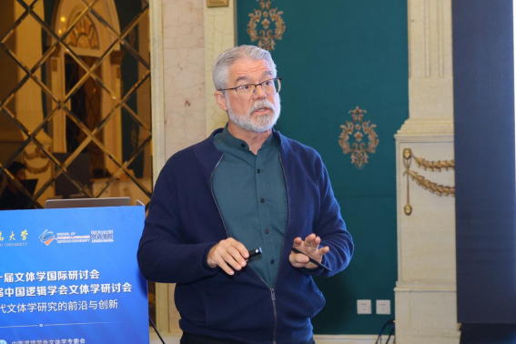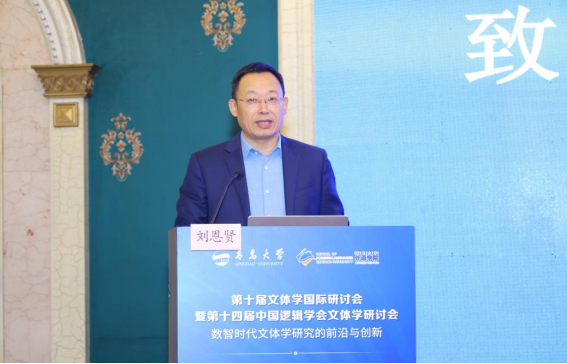 的基本情况和学科特色作了说明。他指出,本届研讨会主题紧密对接国家战略与数智化发展趋势,对推动文体学研究的创新与发展具有重要意义。随后,中国逻辑学会文体学专业委员会主任苗兴伟教授代表专委会致辞。他回顾了文体学研讨会的发展历程,并介绍了本届会议的主题内容。苗兴伟表示,希望与会代表通过大会主旨报告和十个特邀专题论坛,深入交流、凝聚共识,共同探索数智时代文体学研究的新路径。