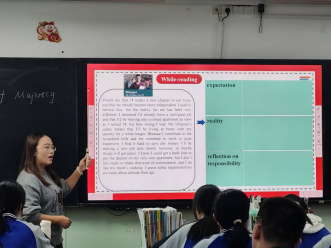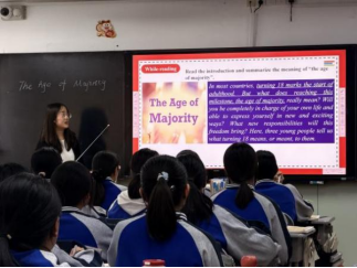 赵虹、陈亦菲、罗甫梅、马优四位研究生同学在高二•四班开展了课堂教学实践展示。同学们以“The Age of Majority”为题,展示了扎实的学科功底与灵活应变的能力。课后的集体教研环节,由梁永召老师主持,四位同学开展了课堂反思与感悟。高晓亮副校长、布占廷副院长、任爽老师进行了指导与点评。