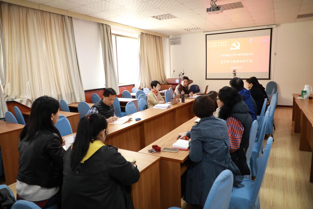 党委召开党史学习教育动员会,学院党政领导、各党支部书记在博文楼312会议室参加现场会,其他党员同志通过钉钉线上参加视频会议。