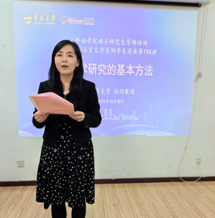 讲座中,赵劲从东、西方对“学术”概念的阐释引出个人对学术的理解。随后,她结合近几年外语学科的国家社科基金立项,从选题、研究过程、研究方案设计、实证研究方法四个方面讲授了如何有的放矢地开展外语学科学术研究的基本方法。赵教授认为:面对当前的技术革新和国家需求,学术研究要从专业领域出发,突破传统外语研究定式,重点关注现实热点、政策导向与学科前沿性问题,方能提高项目申报成功率。在科学研究过程中,要带着问题意识,选择恰当的研究方法设计方案,从问题本身出发,最终完成研究闭环。赵劲还对文科常用的归纳法、演绎法以及溯因法进行了区分,介绍了定量研究与定性研究的方法和要求。