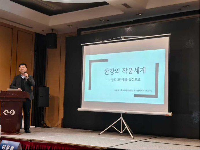 本次比赛还邀请到中国韩国(朝鲜)语教育研究学会常务理事、中央民族大学中国少数民族语言文学学院朝鲜语言文学系的崔有学副教授做主题讲座《韩江的文学世界》。作为韩江作品《植物妻子》的译者,崔有学的讲座不仅是对作家作品的深刻解读,也是对文学创作和阅读体验的启发性指导。
