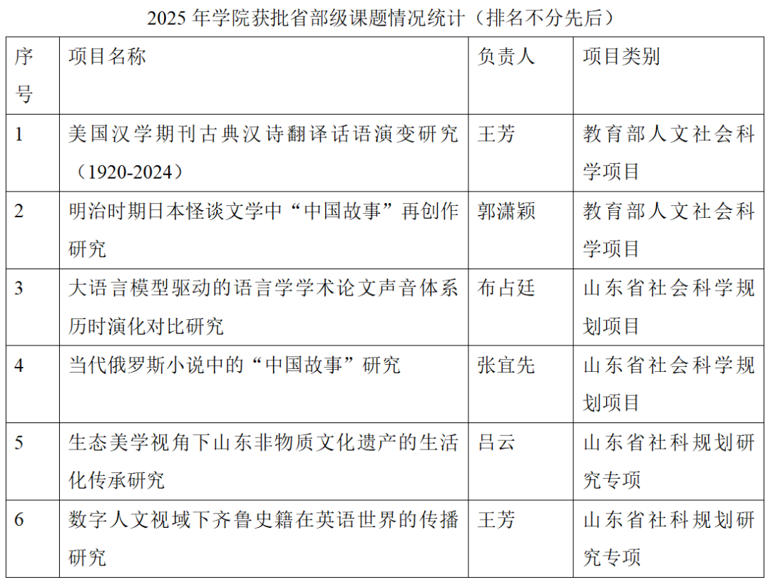 另有2项课题获批山东省2025年度社科规划项目立项,2项于2025年1月获批2024年度山东省社科规划研究专项。