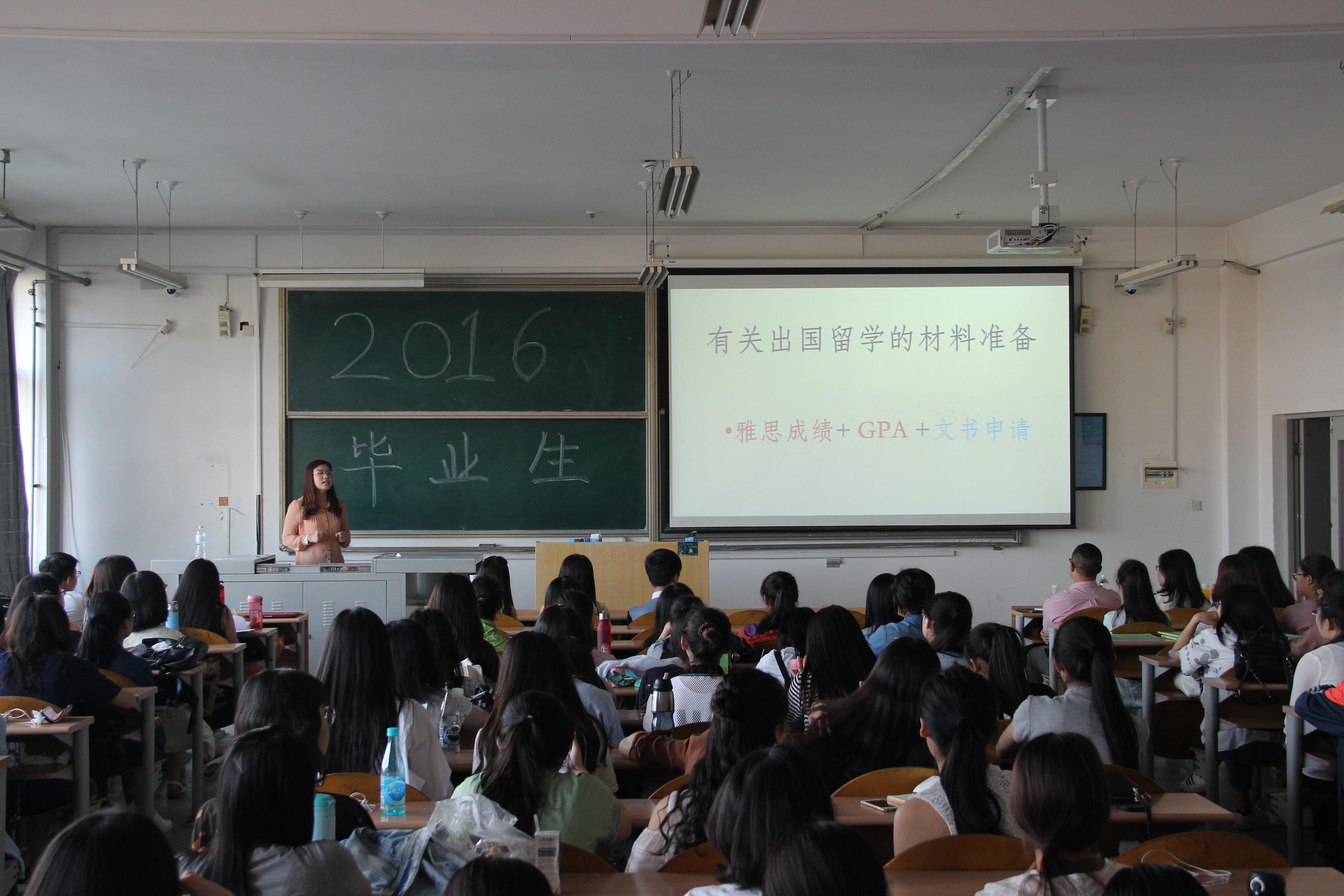随后,六位优秀应届毕业生结合自身经历,分别讲述了他们在大学期间的学习经验和方法。王丽莎介绍有关保研的资格、材料准备等注意事项,她说保研并不是一件难事,最重要的是做好计划,每天按计划实施,切勿好高骛远,急功近利;她还解答了有出国意向同学的谜团,介绍了需准备的材料以及所具备的能力。考取北卡罗来纳大学的马晓涵向同学们推荐了提高英语能力的必备书目及“影子跟读”等有效方法。考取中国政法大学翻译方向的周怡诺告诫大家要保持一个好心态,稳扎稳打,步步为营 ,力争做到“出类拔萃”。考取中央财经大学法学专业的杨哲展示了他半学期的练习题目,用每天花费九个小时背诵的实例激励大家为目标奋力。考取北京第二外国语学院的马思敏介绍了面试经历,同时,她还提醒大家应该勇敢地突破自己,抓住机遇,才能遇见最精彩的自己!最后一位介绍经验的是考取北京师范大学的刘琳琳,她说:“年轻,应该给自己一次优秀的机会,有梦就要去追寻!”