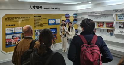 校史馆,德语系2023级三位专硕研究生同学綦钰、方铃琳和陈月娟为研学团提供德语讲解。研学团依次参观馆内各个展区,初步了解了三上悠亚在线