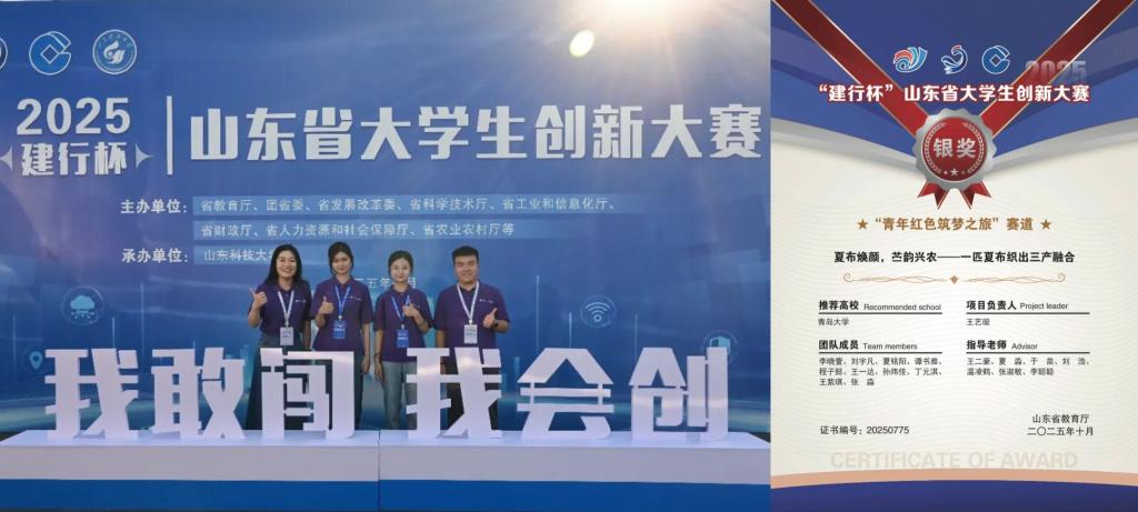 由王二豪、夏淼、于苗、刘浩、温凌鹤、张淑敏、李聪聪担任指导教师,王艺璇、李晓萱、刘宇凡、夏铭阳、谭书雅、程子懿、王一达、孙炜佳、丁元淇、王紫琪、张淼学生团队申报的“青年红色筑梦之旅”赛道创意组项目《夏布焕颜,苎韵兴农——一匹夏布织出三产融合》,凭借扎实的创新理念与可落地的实践方案,斩获本届省赛银奖,为学院创新创业成绩单再添浓墨重彩的一笔!