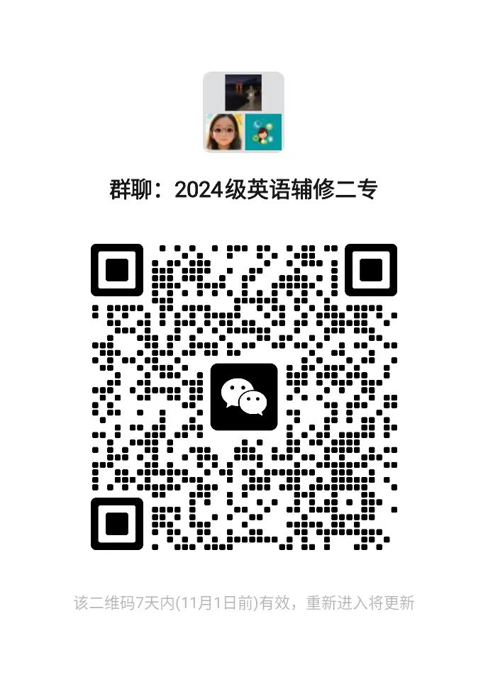 说明:本周第一次课程安排于10月26日(周六)上午8:00 开始 (博远104);下周课程按照课表上课,周五晚上有口语课。试听课为两周,试听周结束录取学生需按修读辅修专业第一学期学分学费标准,通过微信公众号交纳学费;学生一经录取,需按照规定的时间和地点准时上课,如因故要放弃辅修学习资格(包括试听周内),可在规定时间内登录新教务报名系统主动取消报名资格(11月4日-8日),免收学费。试听周结束后如再有退学的,须办理退学辅修专业手续(见教务处官网-下载园地-学生管理“辅修专业退学审批表”),根据相关规定不再退费。 请录取的同学扫描下方二维码入群。